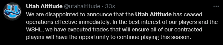 The WSHL kicked off their return season this past weekend, but not without some difficulties. The opening series between Bellingham and Seattle was postponed to a later date, and the Utah/Vernal series was announced as having no broadcast coverage. Following a single game for the Utah Altitude however, they have folded.