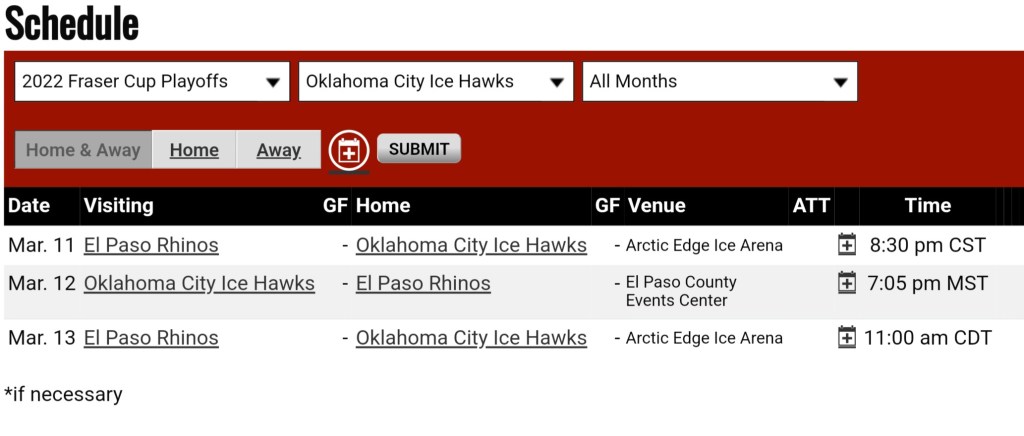 Where this format breaks, is there is no protection for longer road trips. The way the NA3HL schedule reads now, game one starts in OKC at 8:30p Central. At the conclusion of the game, both teams then head to El Paso – an eleven-hour bus ride at minimum – for a 7:05p Mountain (8:05p Central) start.